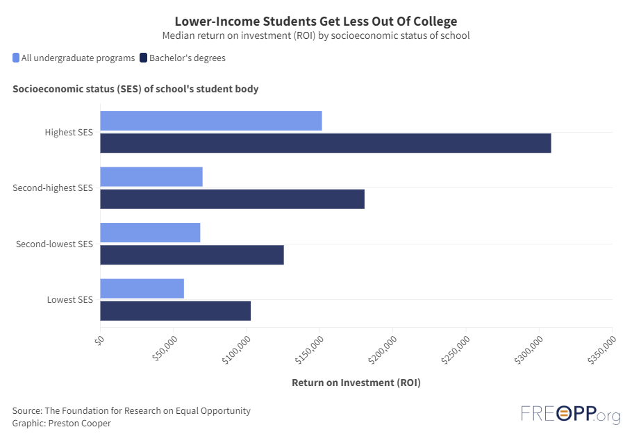 Higher education aspires to be a “great equalizer.” But according to FREOPP’s latest analysis of college return on investment (ROI), lower-income students are realizing far less financial value from college than their higher-income peers. Yet certain bright spots among colleges that serve lower-income students reveal a path towards making higher education pay off more consistently for this group.