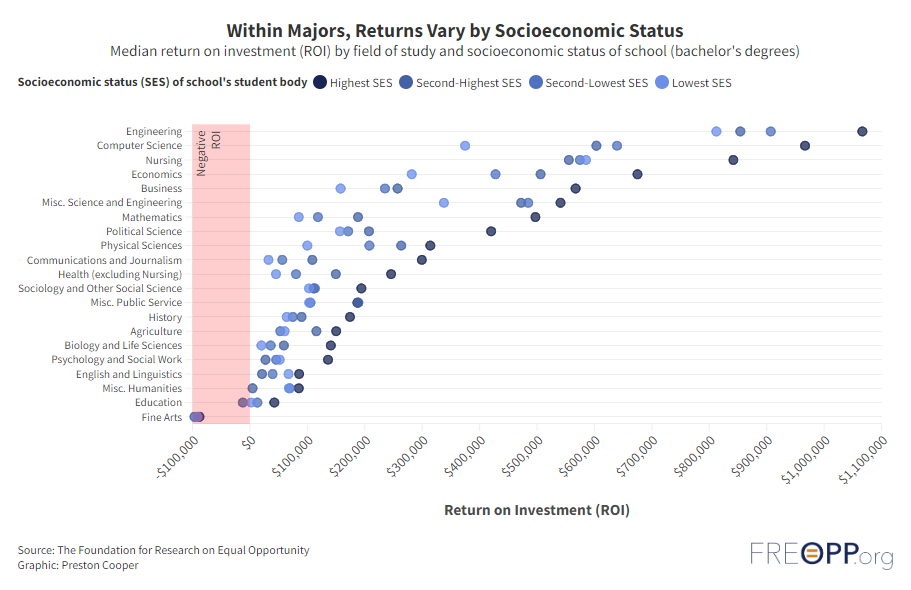 Schools serving higher-income students tend to have a better selection of college majors, from a financial perspective. For instance, engineering programs account for a larger share of enrollment at higher-SES schools than lower-SES schools. But even within the same fields of study, schools serving richer students tend to offer an advantage.