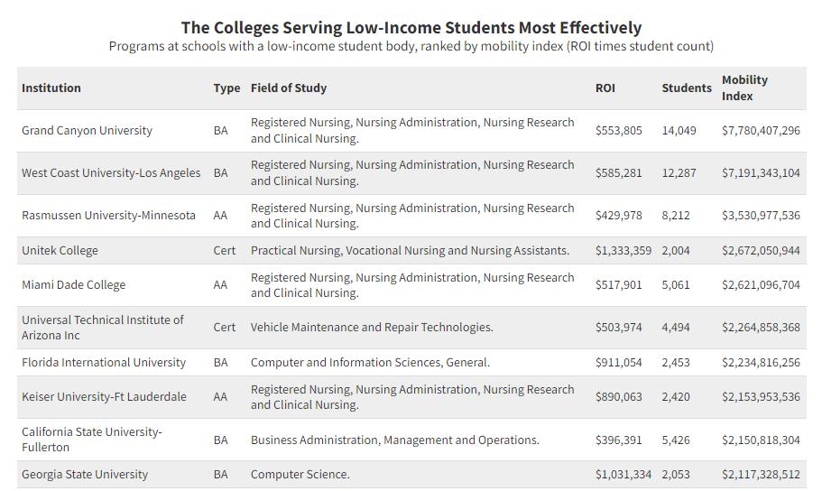 The list includes a number of credentials below the bachelor's degree level, including certificate programs in vehicle maintenance and repair and licensed practical nursing. In the right fields of study, these programs offer a direct pathway into the labor force; they are relatively low-cost and short in duration, and boast high completion rates. Most importantly, they have inclusive admissions practices that make them accessible to lower-income students.