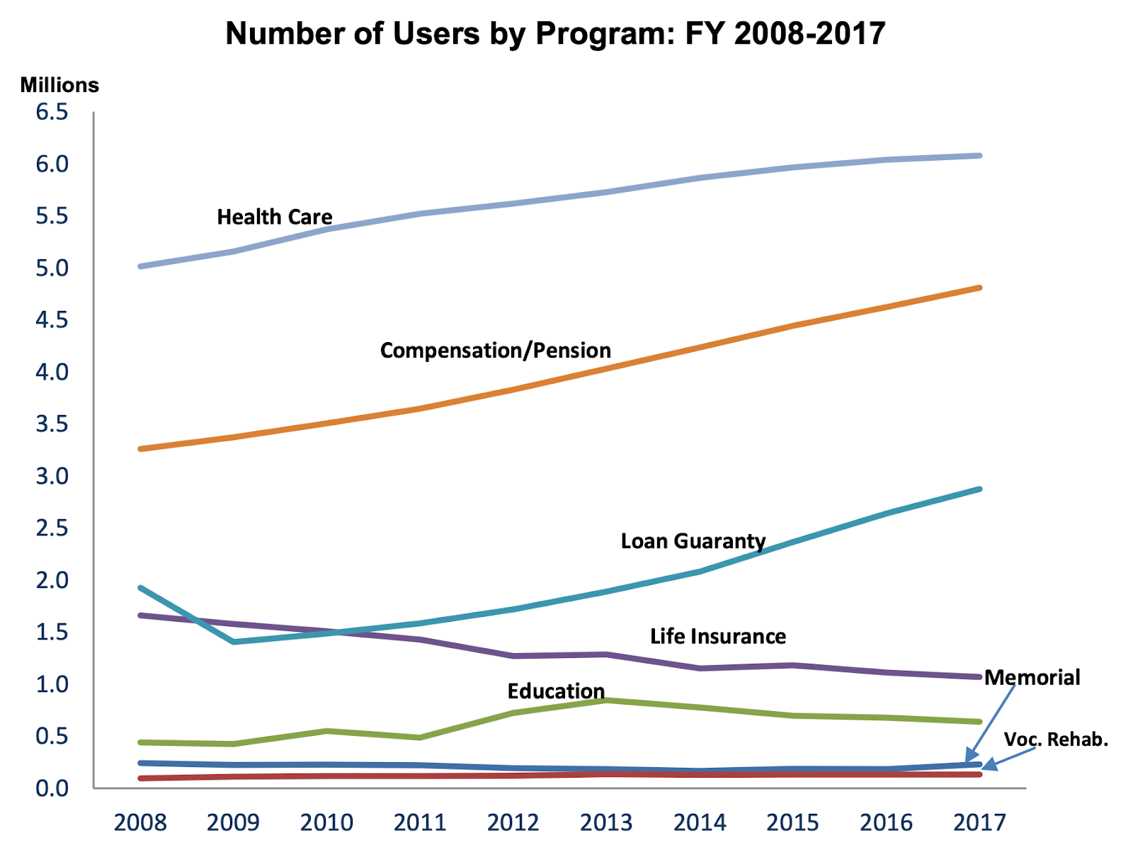 Figure 1. Trends in utilization of VA benefits by veterans, 2008–2017.