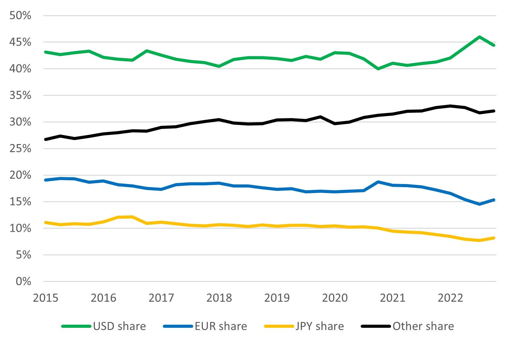 Some short-run variation reflects changes in bilateral exchange rates—e.g., how many dollars you get for one euro—and central bank foreign exchange reserve managers being slow to rebalance. The USD exchange rate massively sold-off in the fourth quarter of 2022. Nonetheless, despite the rise in US dollar bilateral exchange rates toward the end of 2022, the USD share of world central bank currency reserves has been lower since Russia's invasion of Ukraine began.