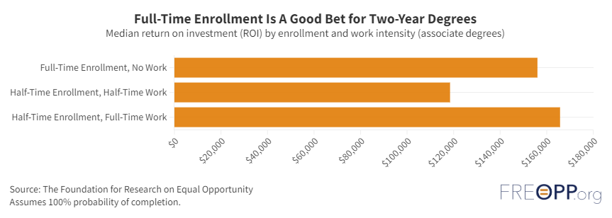 Similar patterns apply for two-year degrees. The median associate degree has an ROI of $156,000 assuming full-time enrollment and on-time completion. This drops to $118,000 for two-year college graduates who enroll half-time and work half-time, but rises to $166,000 for graduates who enroll half-time and work full-time.