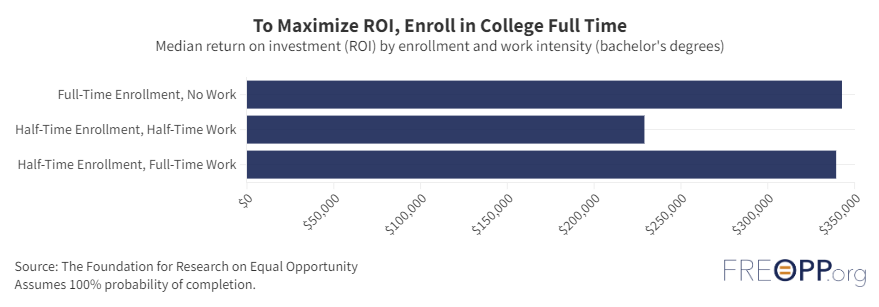 These patterns hold for bachelor’s degrees more broadly. Median ROI for a four-year college graduate who enrolls full-time and finishes within four years is $343,000. ROI for graduates who enroll half-time and work half-time is $229,000, while ROI for graduates who enroll half-time and work full-time is $339,000. Enrolling in college full-time, even with no work, is usually the best financial decision.